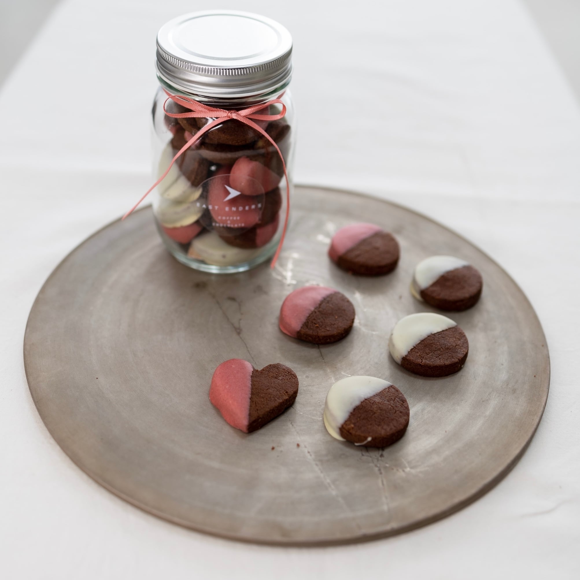 ホワイトチョコ/いちごチョコをディップしたクッキーの2種類です。